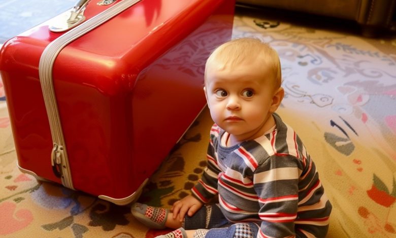 To a child, a suitcase is more than just a piece of luggage—it’s a symbol of the unknown, a gateway to new places, faces, and experiences. The large red suitcase in the image stands as a stark contrast to the child’s small frame, highlighting the vastness of the world that lies ahead. The child’s wide-eyed expression reflects the curiosity and eagerness that children naturally have when faced with the prospect of going somewhere new.