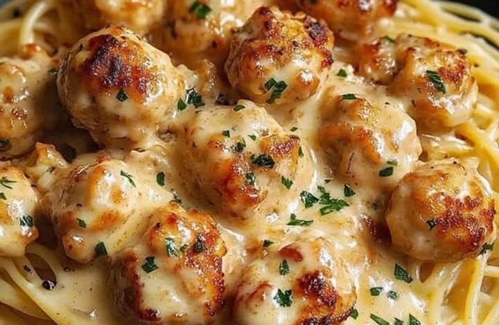 This dish is perfect for a comforting dinner, combining the savory flavors of seasoned chicken meatballs with the richness of a creamy Parmesan sauce. Enjoy this hearty meal with a side of garlic bread for a complete dining experience.