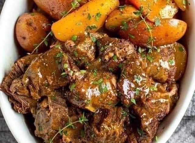 Put the meat back into the pan. Carrots and potatoes should be placed next to the soup. Bake, covered, at 350°F for 2 1/2 to 3 hours.