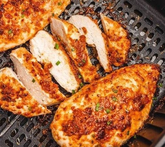 • Air fry for 10 minutes. Flip the chicken breasts and continue to cook for an additional 6-8 minutes, or until the chicken is golden brown and the internal temperature reaches 165°F (74°C).