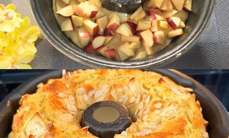 - Assemble the Cake: Pour half of the batter into the prepared pan. Add half of the diced apples over the batter. Pour the remaining batter over the apples and top with the remaining apples.