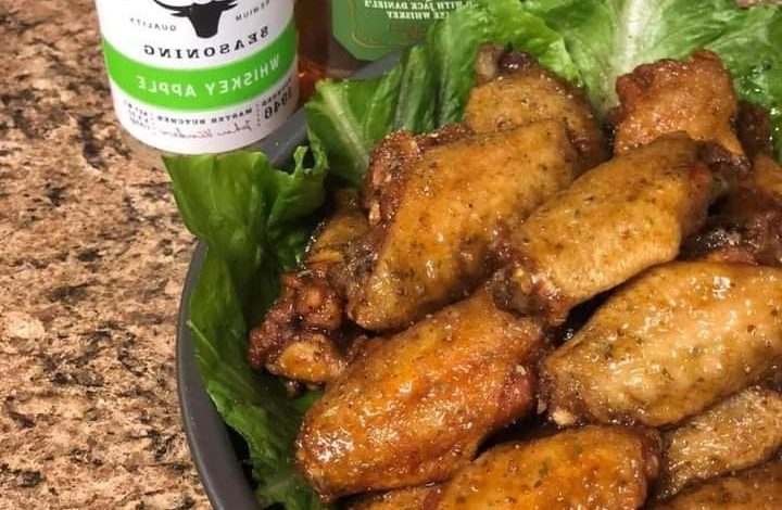 - In a large bowl, toss the chicken wings with olive oil, Kinders Whiskey Apple seasoning, salt, and black pepper until well coated.