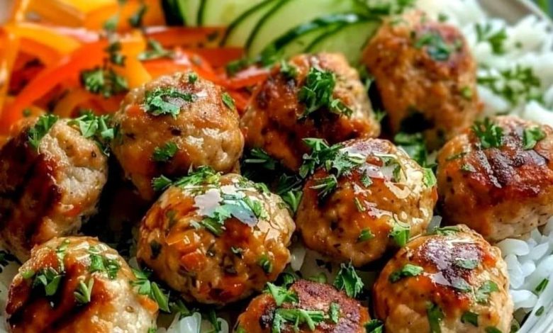 Asian-Style Chicken Meatballs with Rice and Vegetables