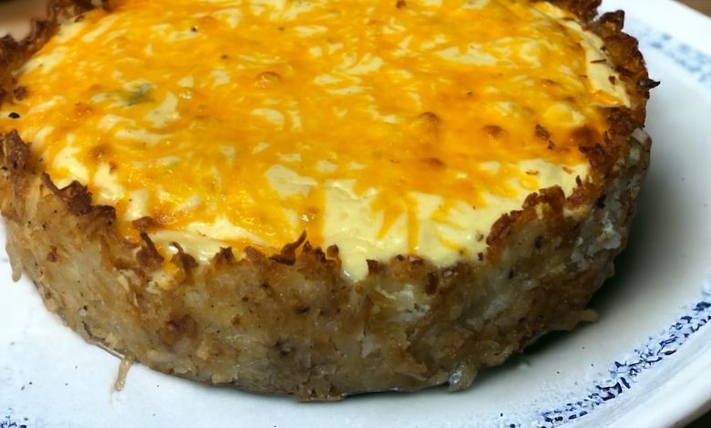 In the bowl with the hash browns, add Cheddar cheese, butter, garlic powder, salt and pepper and stir well.Add the hash brown mixture to the prepared pan. Press the dough evenly along the bottom and sides of the pan, about 1/2 inch from the top of the pan, making sure to cover any holes or cracks.