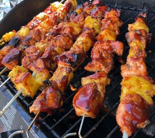 Thread the red onion, piece of red bell pepper (pepper), pineapple, green pepper, bacon and chicken onto skewers and wrap the bacon around the chicken as shown in the picture above. Repeat until all the chicken is used up.Brush skewers evenly with HALF of the marinade (reserve the other HALF for basting). Brush
