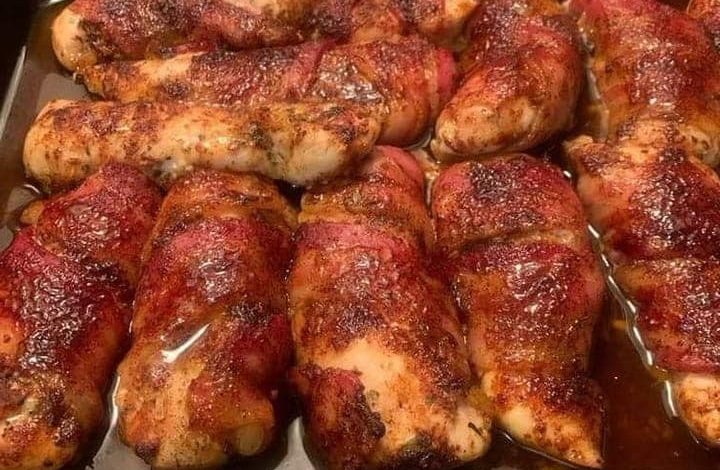 • Bake in the preheated oven for 20-25 minutes, or until the bacon is crispy and the chicken is cooked through.