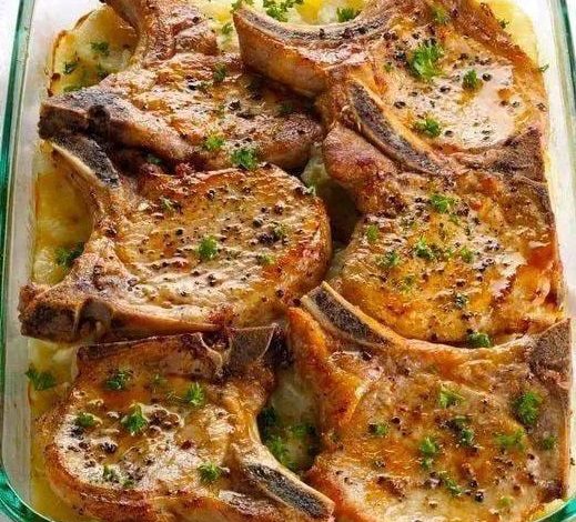- Serve hot, with the creamy potatoes and onions alongside the pork chops.
