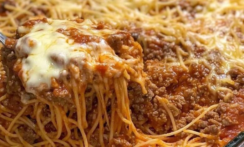 • Add the remaining spaghetti on top, followed by the rest of the meat sauce.
