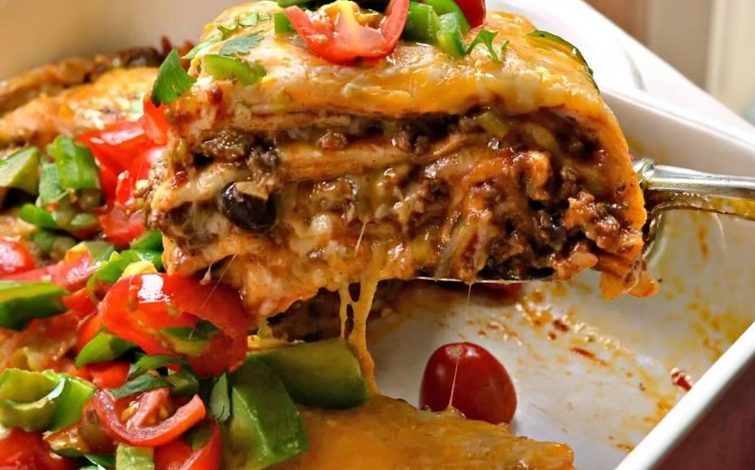 Place the casserole: Spread 2 tablespoons of enchilada sauce on the base of the dish you prepared. Top with a quarter of the tortillas, then a third of the beef mixture, and a quarter of each cheese. Repeat this process two more times and finish with the final tortilla layer. Top with remaining soy enchiladas and remaining cheese.