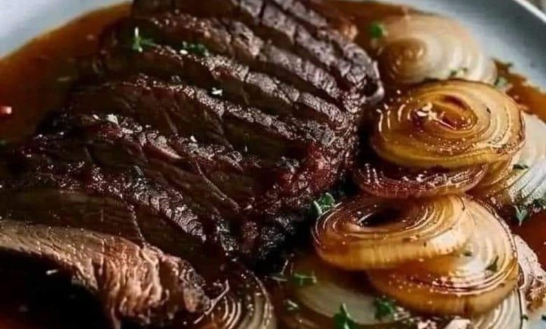 - Serve the sliced beef roast with the caramelized onions and sauce from the pot.