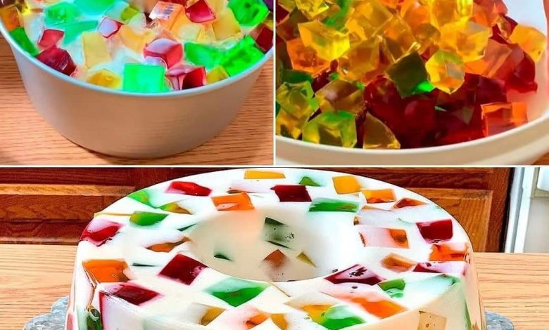 - Make sure the white mixture is cool before pouring it over the cubes to avoid melting the colored jello.