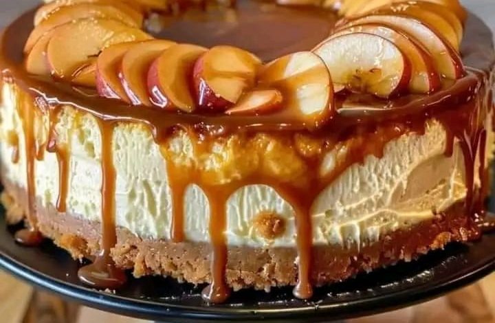 • Drizzle the cooled caramel sauce over the apple-topped cheesecake.