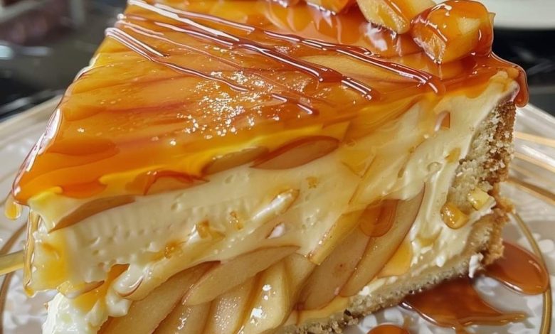 - Pour the remaining cheesecake batter over the apples, smoothing the top.