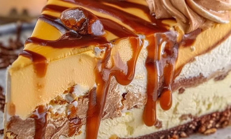 - Spread the softened caramel ice cream over the chocolate layer. Freeze for at least 2 hours or until the ice cream layers are completely set.