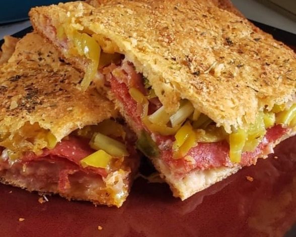 Place a layer of ham, Swiss cheese, salami, protolon cheese, sausage and red pepper on the dough.