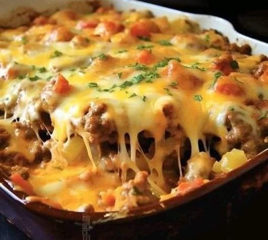 • Serve warm and enjoy your cheesy beef and potato casserole!
