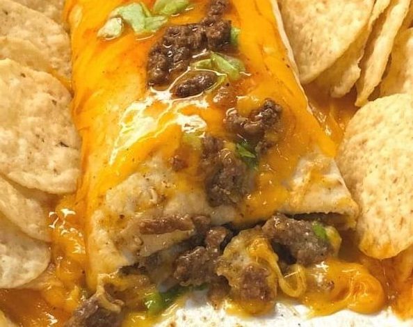 - Repeat with another layer of tortilla strips, the remaining beef mixture, another third of the cheese, and a final layer of tortillas.