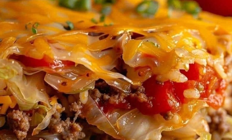 - Assemble Casserole: In a greased 9×13 inch baking dish, layer half of the cabbage on the bottom. Spread half of the meat and rice mixture over the cabbage. Repeat layers with the remaining cabbage and meat mixture.