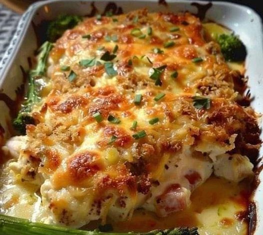 - In the prepared casserole dish, layer the cooked rice or pasta (if using), followed by the chicken and broccoli.
