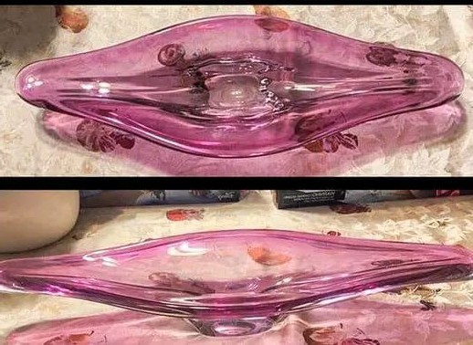 Design and Use: The piece you have is distinctive for its elongated, boat-like shape and the deep pink color. Such dishes are often used as centerpiece bowls, candy dishes, or for serving nuts and small snacks. It’s also possible that it was intended purely as a decorative item.