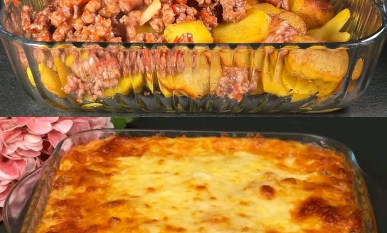 - Add Meat Mixture: Spread the meat mixture evenly over the potatoes.