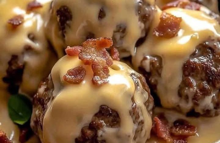 4. Combine: Return the meatballs to the skillet and pour the cheese sauce over them. Sprinkle with shredded cheese and cooked bacon.