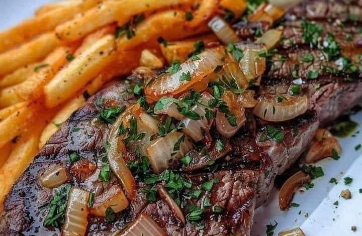 Enjoy this delicious grilled steak with caramelized onions and herb fries, a perfect combination for a hearty and flavorful meal!