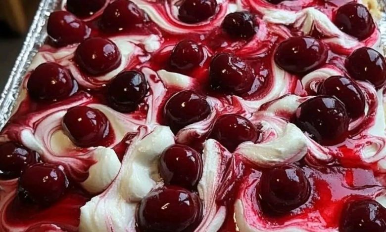 Just before serving, you can pipe or dollop whipped cream on top and swirl it slightly into the cherries for an elegant finish. Cut into squares or slices.