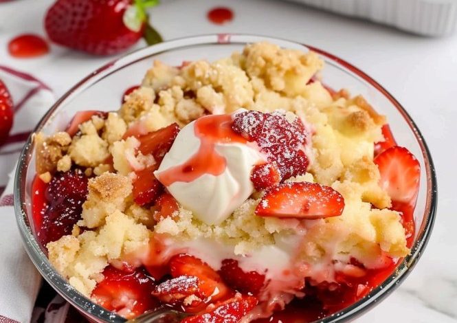Spread both strawberry shortcake tins evenly on the bottom of the prepared plate.