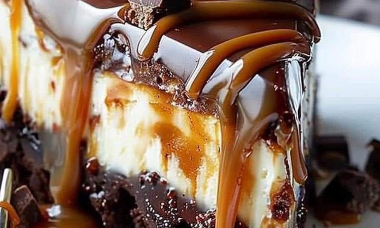 - Drizzle the caramel sauce over the top of the cheesecake.