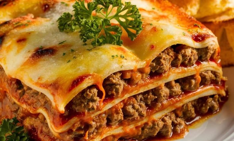 • To assemble, spread 1 1/2 cups of meat sauce in the bottom of a 9×13 inch baking dish. Arrange 6 noodles lengthwise over meat sauce. Spread with one half of the ricotta cheese mixture. Top with a third of the mozzarella cheese slices. Spoon 1 1/2 cups meat sauce over mozzarella, and sprinkle with 1/4 cup Parmesan cheese. Repeat layers, and top with remaining mozzarella and Parmesan cheese.