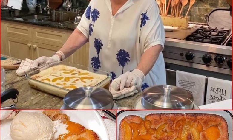 - Bake in the preheated oven for 40-45 minutes, or until the top is golden brown and the batter has risen around the peaches.