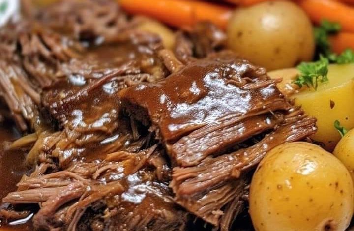 - Slice the roast and serve with the potatoes and carrots. Drizzle the gravy over the top.