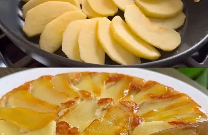 - Carefully place a large serving plate over the skillet. Using oven mitts, quickly flip the skillet to invert the tart onto the plate. Be cautious of any hot caramel drips.