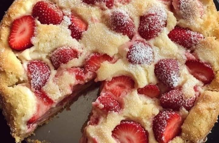 • Arrange the halved strawberries on top of the batter, cut side down, pressing them slightly into the batter.