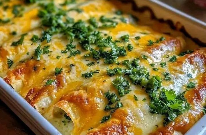 Pour the green chili sauce over the enchiladas and top with the remaining cheese.