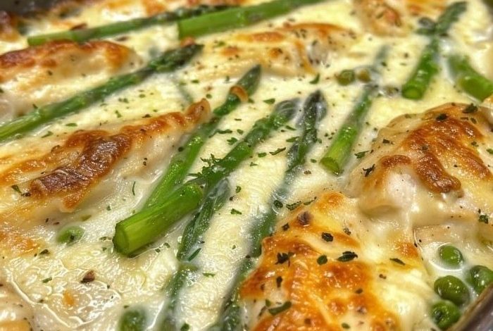 Enjoy your creamy baked chicken with asparagus and peas, a perfect comforting and delicious meal!