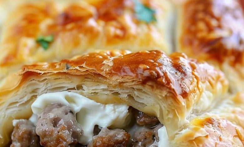 - Place a spoonful of the sausage filling in the center of each pastry square.