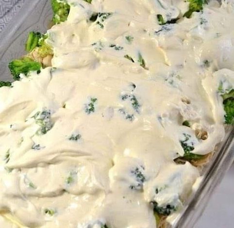 • Pour the creamy sauce mixture over the broccoli and chicken, spreading it out evenly.