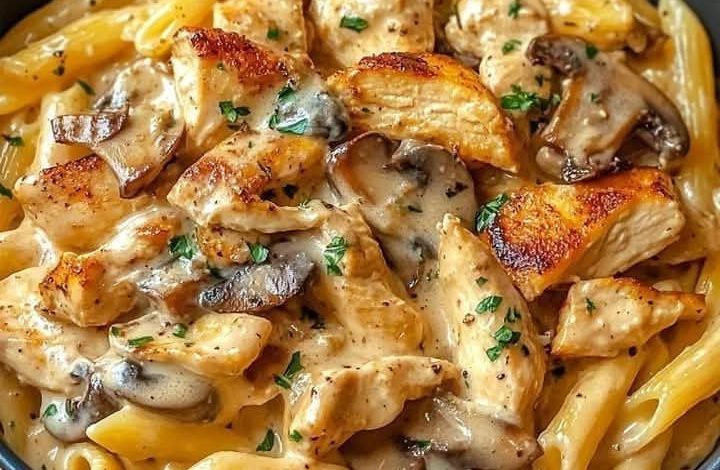 • Sprinkle with fresh parsley before serving. Enjoy your creamy chicken and mushroom penne pasta while warm!