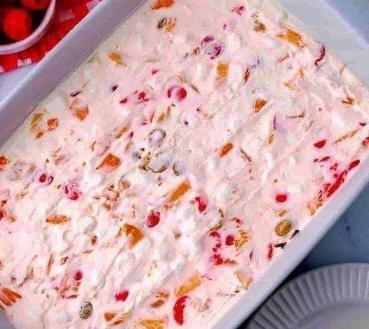 • In a large mixing bowl, combine the drained pineapple chunks, mandarin oranges, halved maraschino cherries, miniature marshmallows, and sweetened shredded coconut.