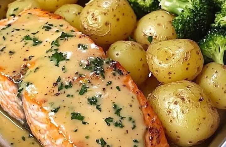 Creamy Garlic Butter Salmon with Roasted Potatoes and Broccoli