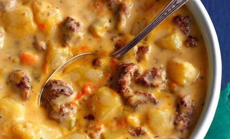 In a large skillet, add beef and grill Cook until the onion softens and the ground meat turns brown. Kuramo amavuta. Fira tungurusumu kugeza zijimye kandi zihumura. Ongeramo inyama zinka zivanze mumasafuriya cyangwa ububiko ku ziko. Ongeramo ibirayi, umufa, imboga, ibase na peteroli. Teka mu gikono munsi yamasaha 6-8, hejuru ya 3-4, cyangwa ushire ku ziko kugeza ibirayi bitoshye kandi bitangiye gushonga bigaragara. Soak the corn in milk and add it to the soup. Add Velveeta and let it melt, stirring occasionally. When it melts completely, divide it into bowls and serve.
