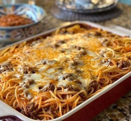 Pour half of the taco meat mixture over the spaghetti in the baking dish.