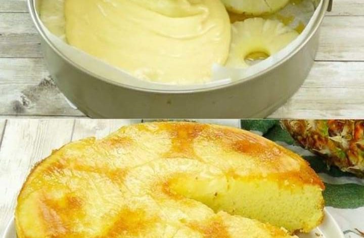 - Pour the batter over the pineapple rings in the cake pan, spreading it evenly.