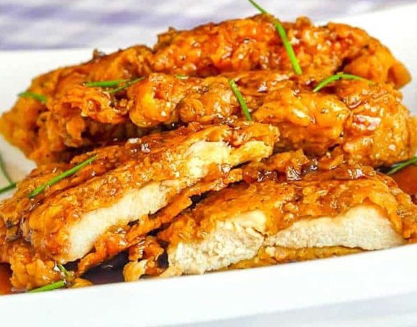 Dip the chicken fillets into the egg mixture, then mix with the flour and repeat twice.