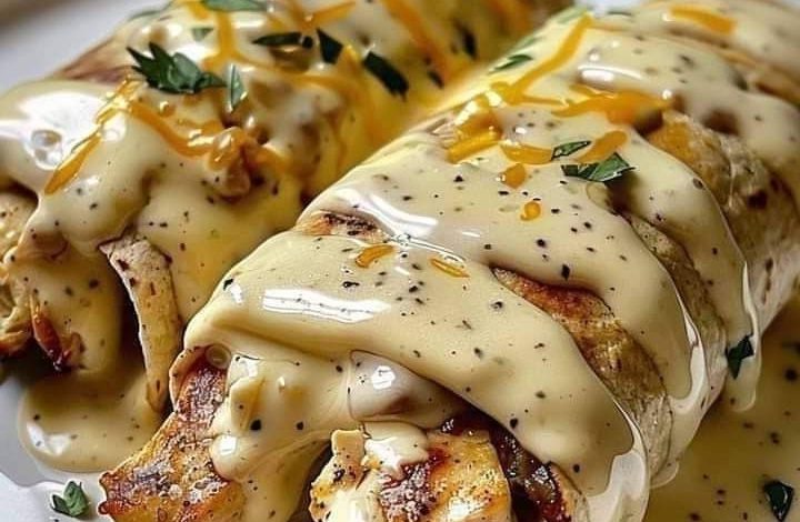 • Pour the creamy sauce over the burritos, ensuring they are fully covered.