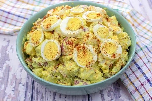 3 – While the potatoes are cooking, combine the mayonnaise, mustard, onions, pickles, pickle juice, hard-boiled eggs, salt and pepper in a large bowl and mix well. Add the cooked potatoes and fold in.4 – Garnish with a dash of paprika.