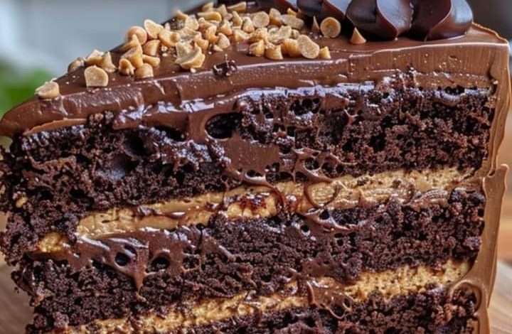 6. Assemble the Cake: Place one cake layer on a serving plate. Spread a generous layer of peanut butter over the top. Add a layer of chocolate frosting over the peanut butter. Repeat with the second layer. Place the final cake layer on top, and frost the top and sides of the cake with the remaining chocolate frosting.