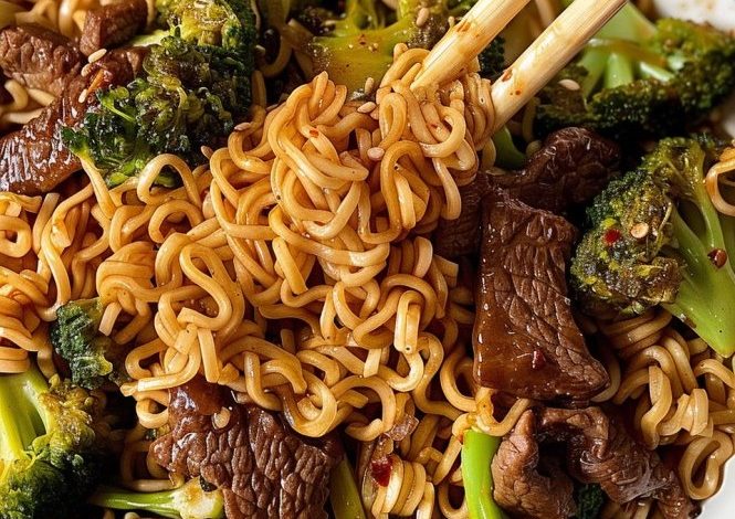 Add the cooked ramen pan to the plate and stir to combine the meat and broccoli.